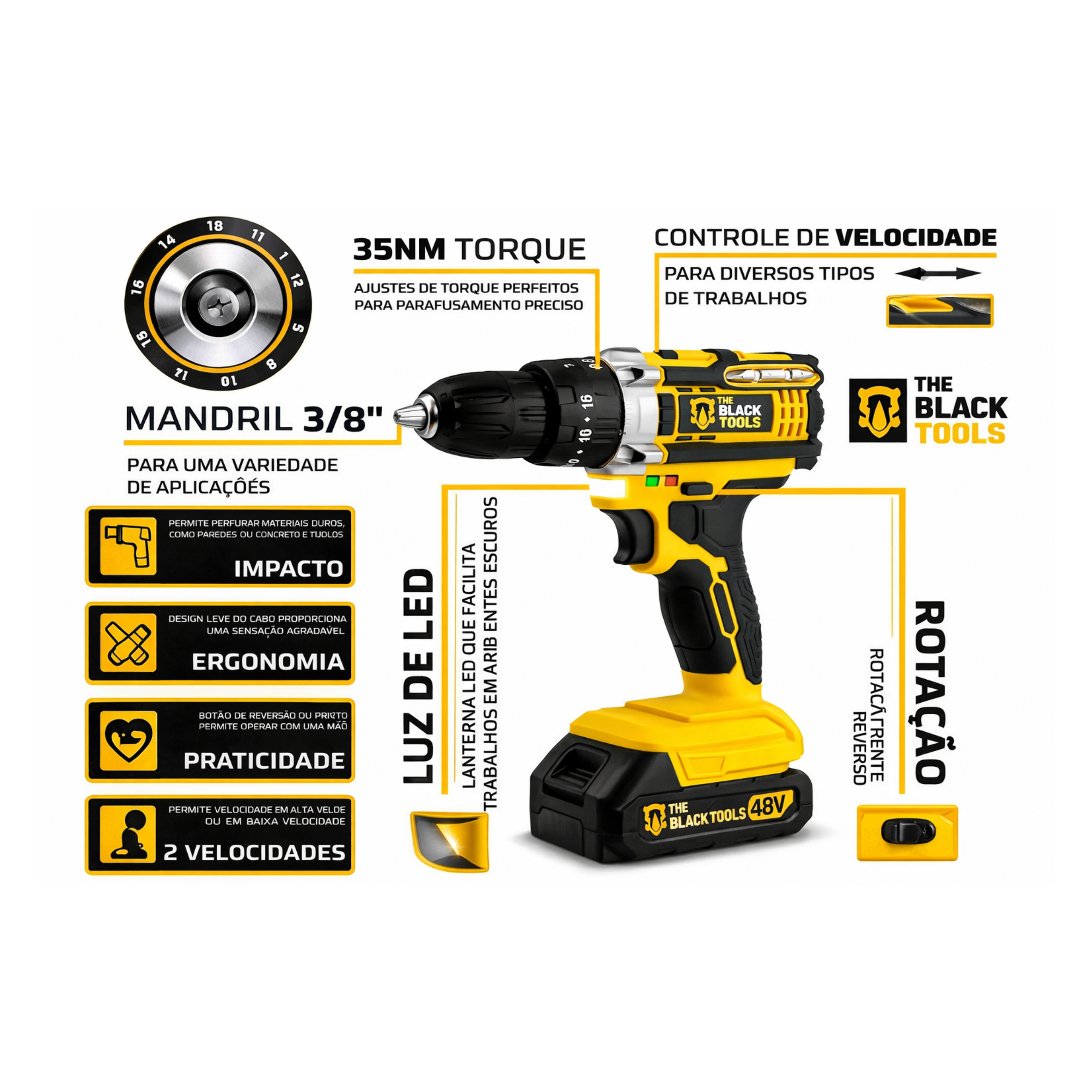 Pare de depender de três ferramentas diferentes. A The Black Tools faz tudo: perfura concreto, parafusa com precisão e tem função impacto para os trabalhos mais exigentes. Potente, sem fio e pronta para qualquer desafio. Uma ferramenta profissional, no preço que você merece.